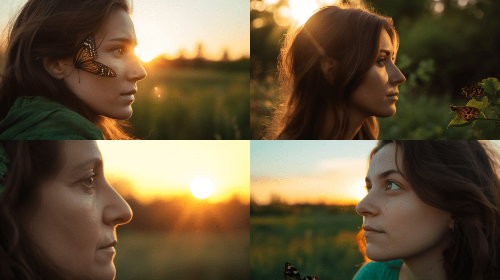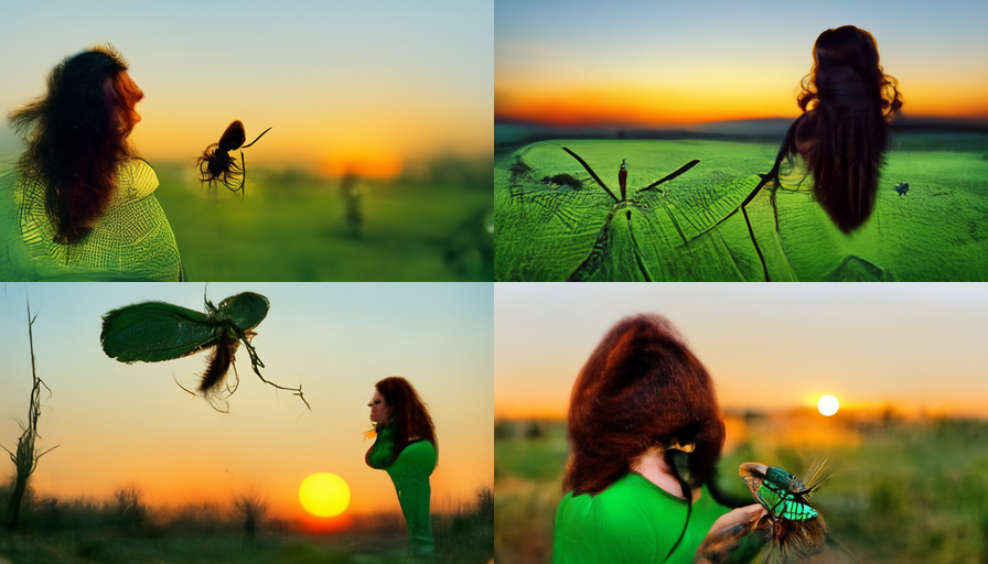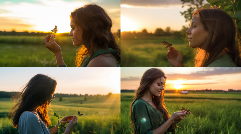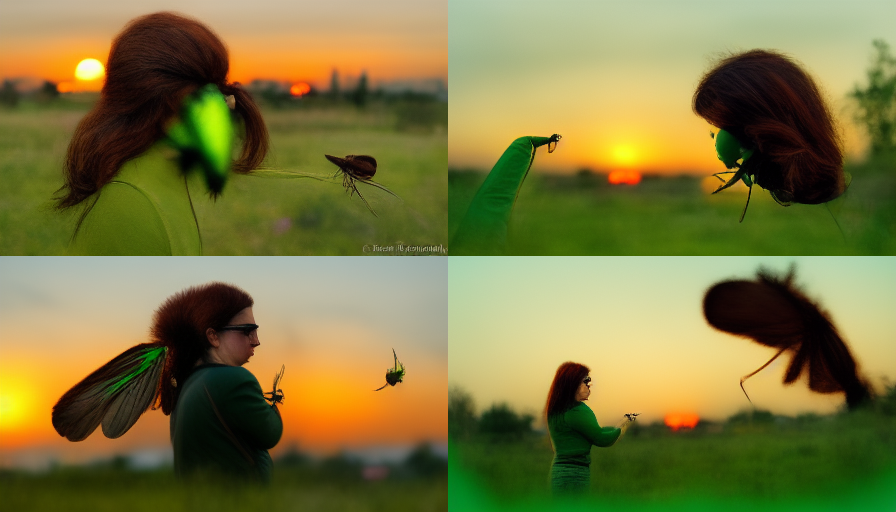 photo of a 30 year old woman with brown hair looking at a green butterfly. Sunset –ar 16:9
